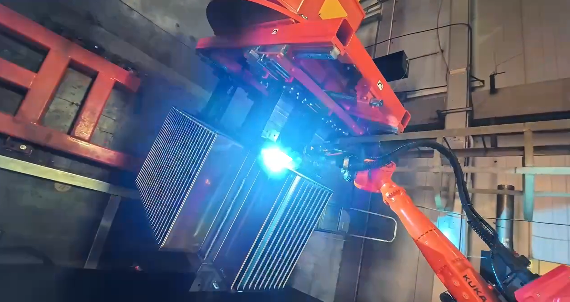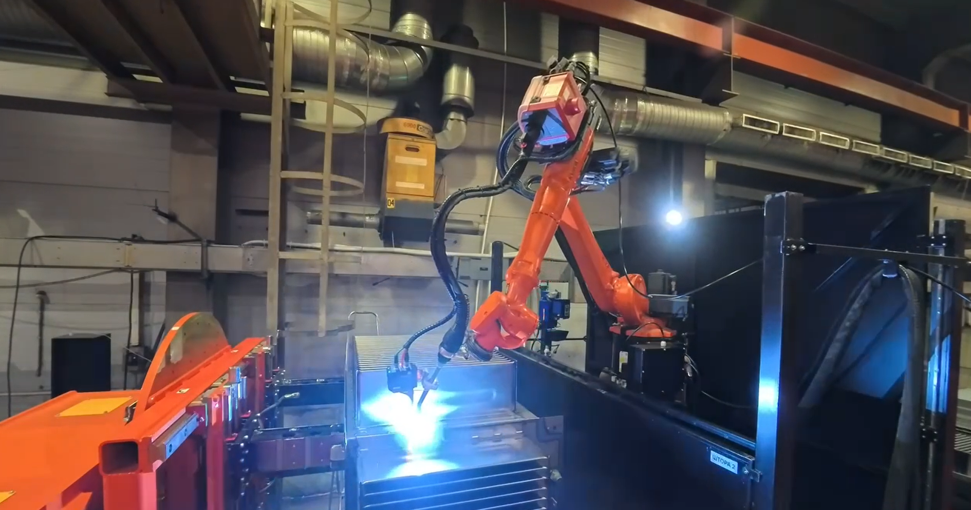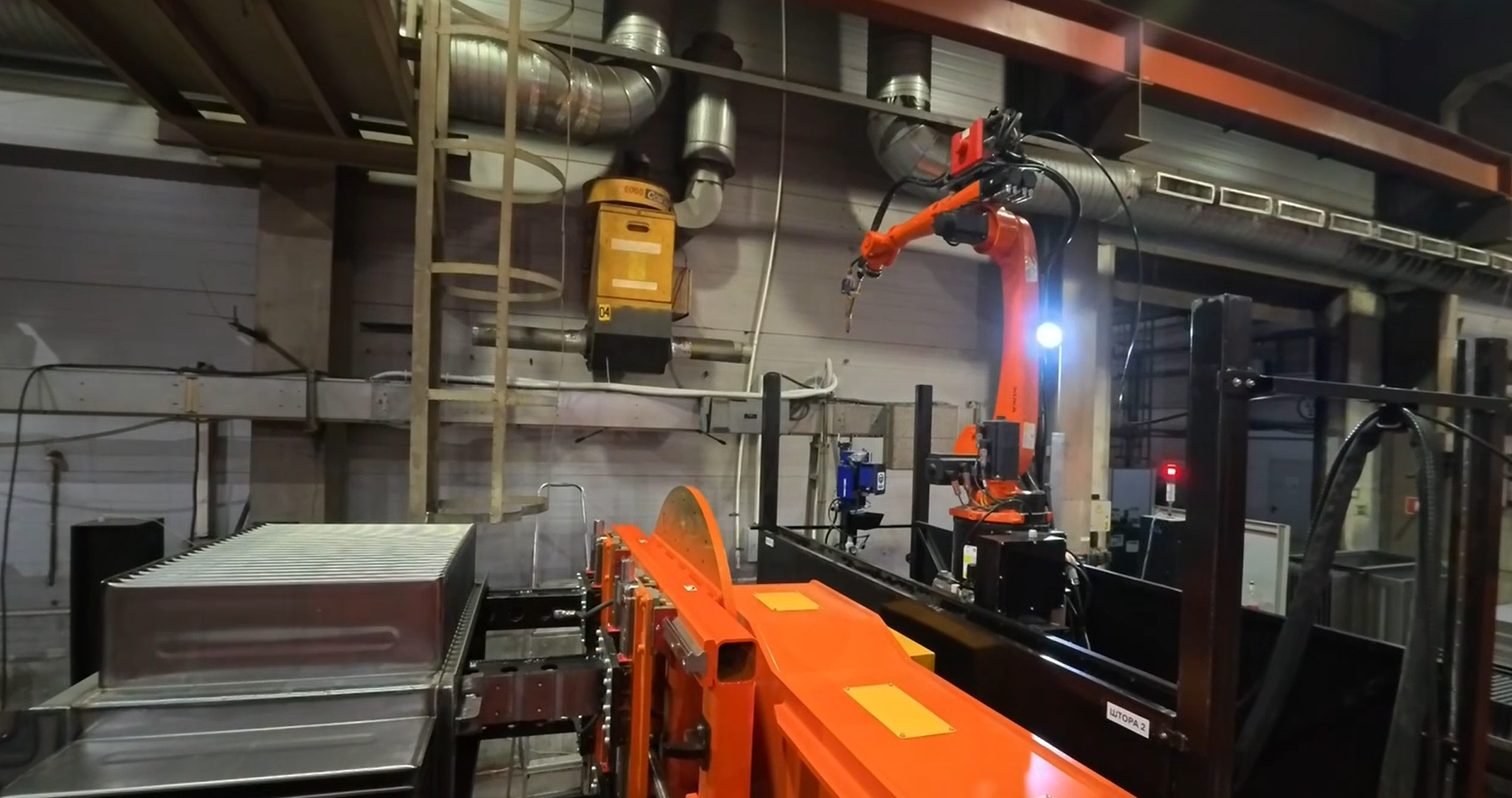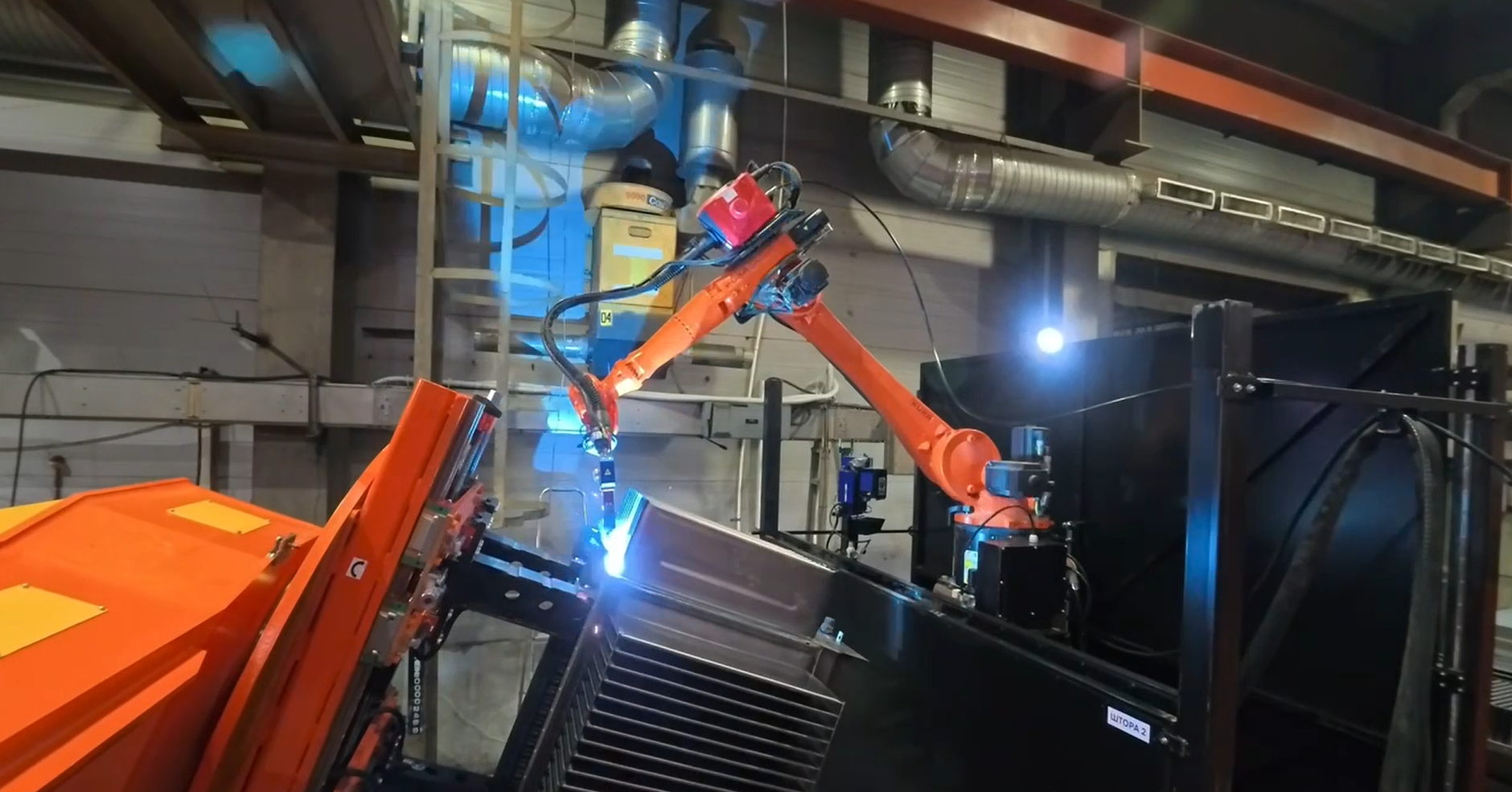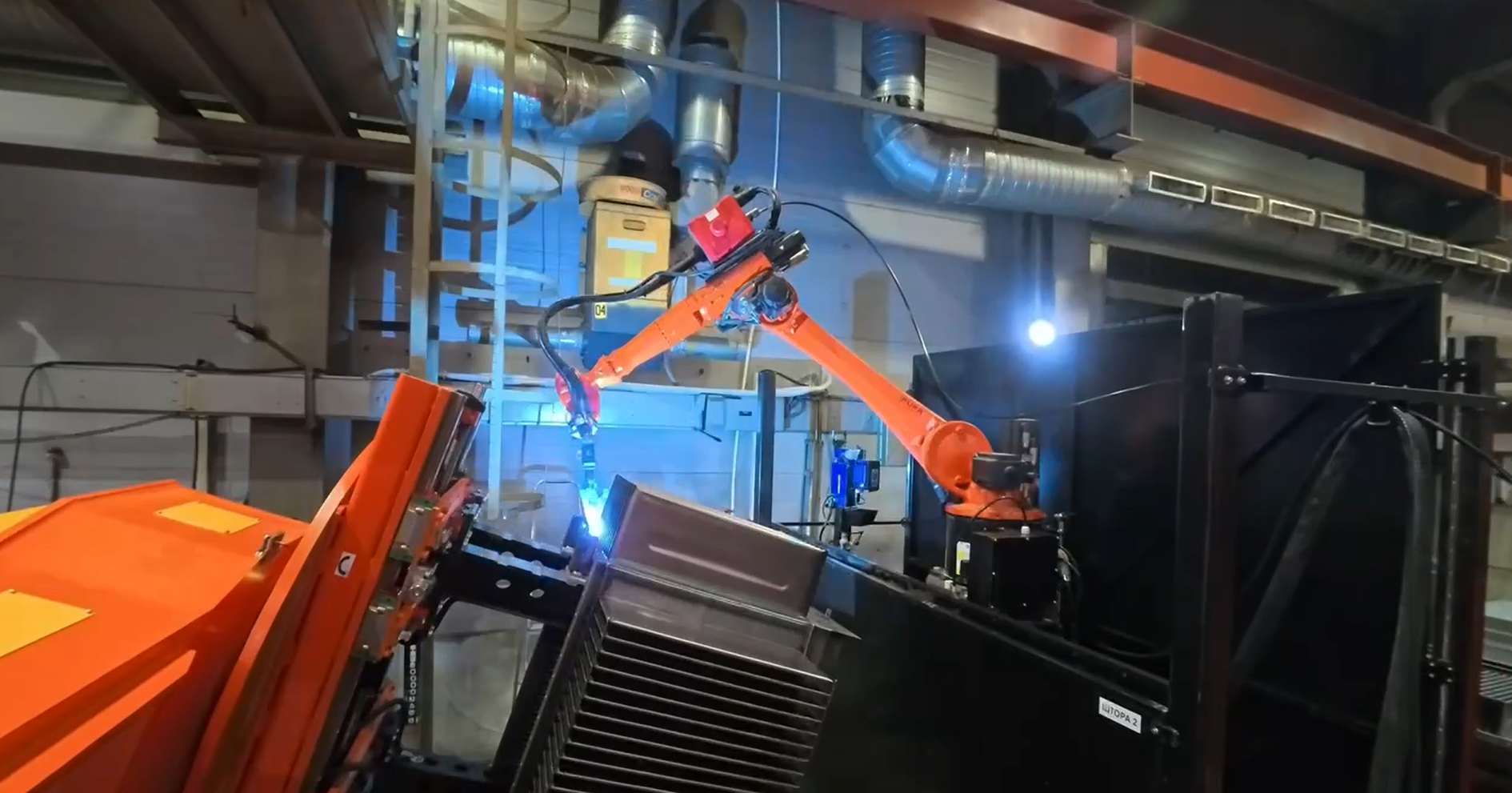 - После окончания сварки робот выходит в домашнее положение и сообщает оператору, цикл закончен, зона безопасна, можно входить в зону робота. При несанкционированном проникновении робот останавливается и выходит в ошибку.